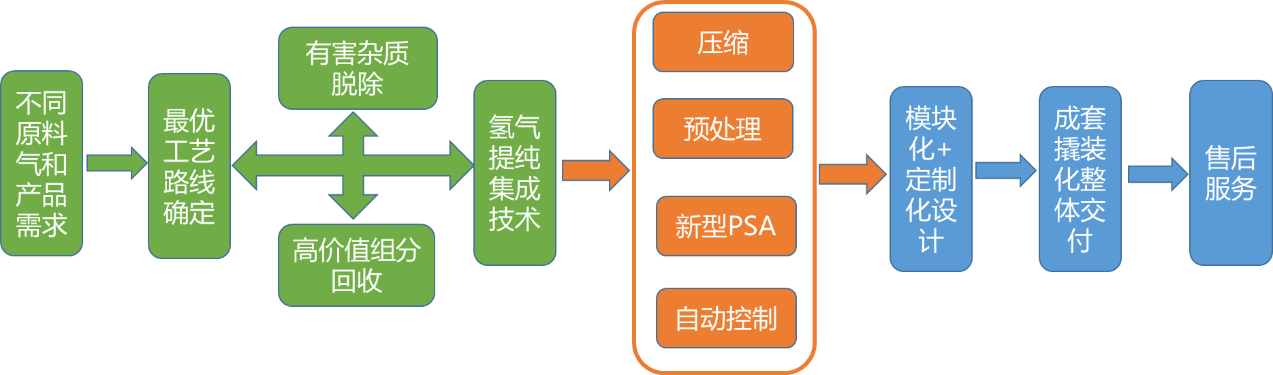 該技術(shù)是一種基于資源端富氫氣體的不同場景并集成高效提純設(shè)備的技術(shù),通常用于石化及煤化工等領(lǐng)域富氫尾氣的氫氣提純再利用或直接作為氫能用戶的成套技術(shù),尤其適合幾百方至兩萬方以下的小規(guī)模分布式氫氣提純,并能滿足氫能指標(biāo)的提純要求。